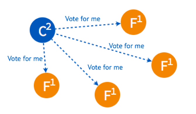 在一个节点倒计时结束 (Timeout) 后,这个节点的状态变成 Candidate 开始选举,它给其他几个节点发送选举请求 (RequestVote)