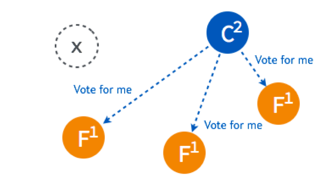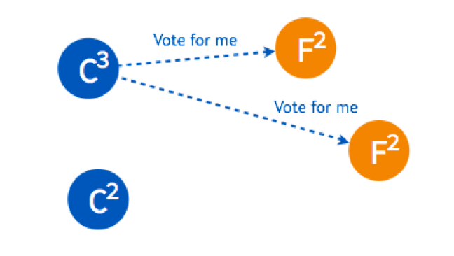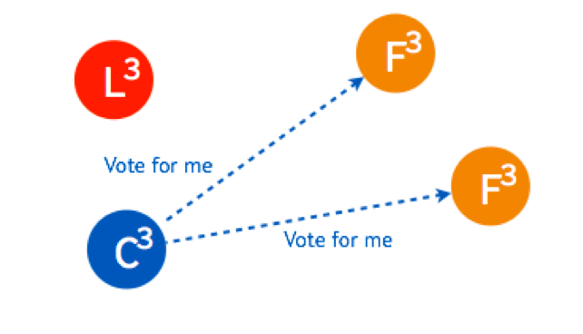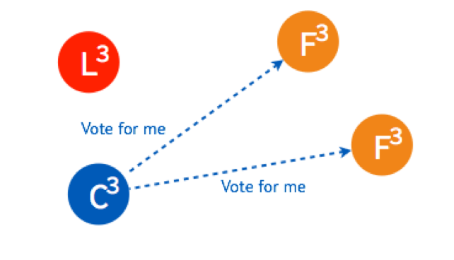 这时,两个节点的状态是 Candidate,两个是 Follower,但是他们的倒计时器仍然在运行,最先 Timeout 的那个节点会进行发起新一轮 Term 3 的投票。