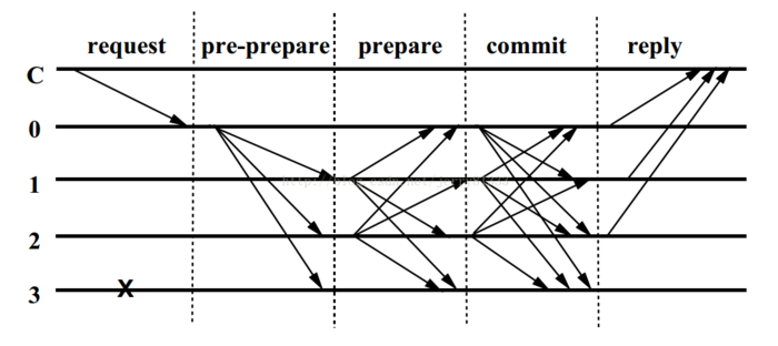 [2] 联邦拜占庭协议(FBA,Federated Byzantine Agreement):另一类拜占庭将军问题的解决方案是 FBA,已被 Stellar 和 Ripple 等代币使用。FBA 的通用理念是每个拜占庭将军负责自身的链、消息一旦到来,通过排序建立事实。在 Ripple 中,将军(验证者)是 Ripple 基金会预先选定的。在 Stellar 中,任何人都可以成为验证者,需要用户选择去相信哪个验证者。 由于 FBA 可提供令人难以置信的吞吐量、低交易开销和网络扩展性,我相信 FBA 类公式算法是目前提出的最好的分布式共识发现算法。 技术原理: PBFT基于拜占庭将军问题,一致性的确保主要分为这三个阶段:预准备(pre-prepare)、准备(prepare)和确认(commit)。流程如下图所示: