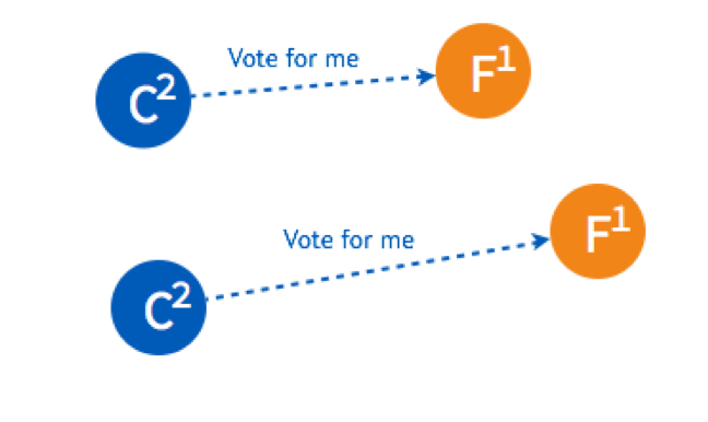 两个 Candidate 会分别给另外一个还没有给自己投票的 Follower 发送投票请求。