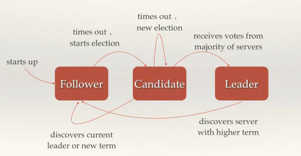 从拜占庭将军的故事映射到分布式系统上,每个将军相当于一个分布式网络节点,每个节点有三种状态:Follower,Candidate,Leader,状态之间是互相转换的,可以参考下图: