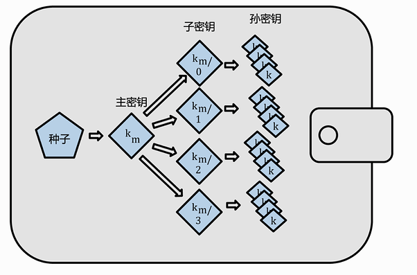 钱包是私钥管理工具,我们可以根据使用需求生成很多私钥。但是你会发现备份和管理私钥是非常麻烦的。最早期的 BTC 钱包就是这样的,所以他还有一个昵称“Just a Bunch Of Keys”(一堆私钥)。为了解决这种麻烦,就有了 BIP32 31 提议:根据一个随机数种子通过分层确定性推导的方式得到 N 个私钥,这样保存的时候,只需要保存一个种子就可以了,私钥可以通过种子推导出来,如图: