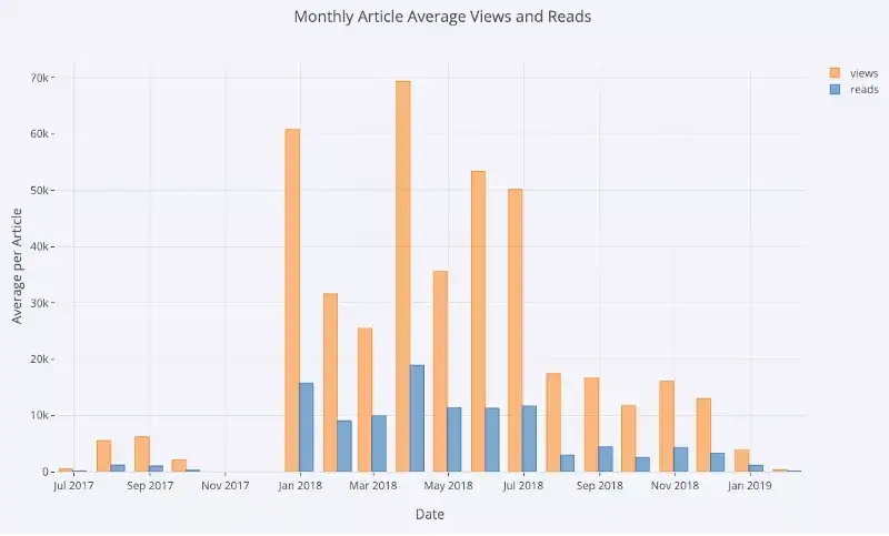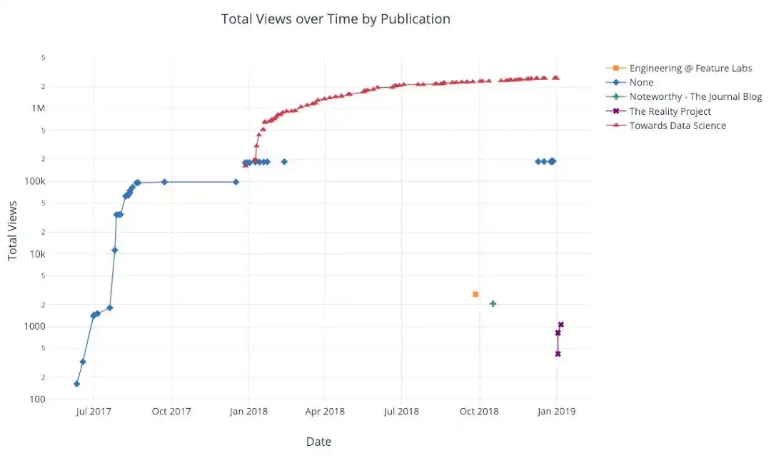 结合 pandas 对数据进行统计处理,我们可以得到很多非常有价值的图,比如下面这张关于不同文章发表渠道的读者点击查看数量的变化趋势图,显然名为Toward Data Science的发表渠道能给文章带来更多的点击量。