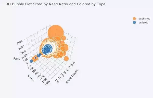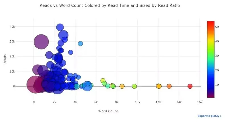 如果要在图表中体现三个数值变量,我们还可以使用气泡图,如下图:横坐标、纵坐标、气泡的大小分别代表三个不同的变量——文章字数的对数、阅读数量、阅读比例。