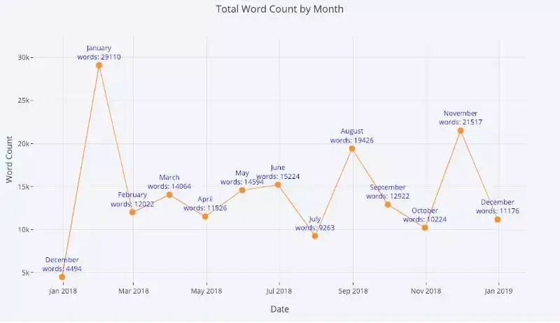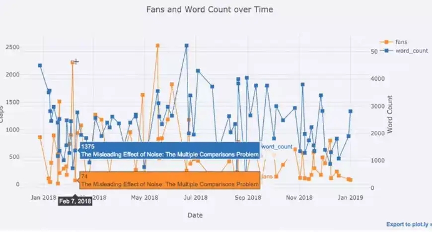 现实世界中的大部分数据都与时间相关。幸运的是,plotly + cufflinks 在设计之初就考虑到了时间序列的可视化。让我们来创建一个关于我写过文章情况的 dataframe,看看它的各项指标是怎么随着时间变化的。