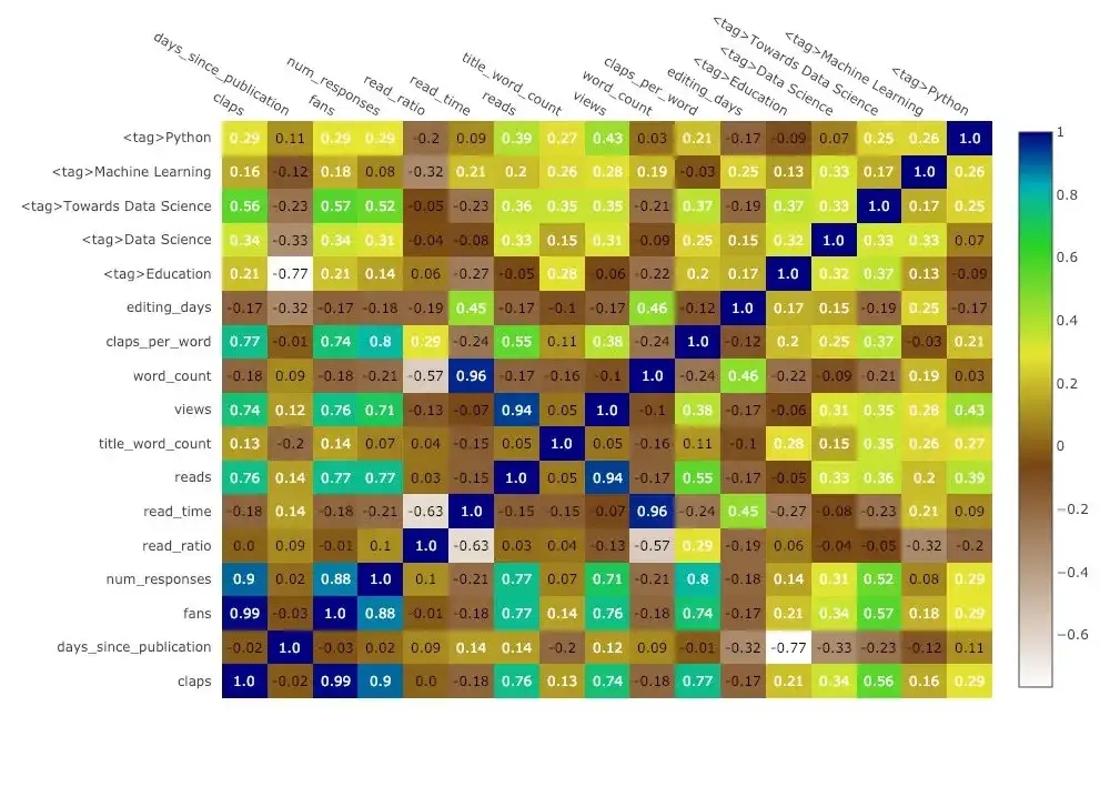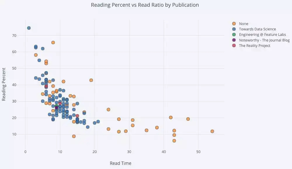 单变量-单变量制图是开始一个数据分析的标准方法。直方图是绘制单变量分布的首选方式。在这里,我使用的数据来源是我个人在 medium 网站上所写过文章的统计信息,让我们先来制作一个关于文章点赞次数的交互式直方图(df 是一个标准的 Pandas 数据结构)。