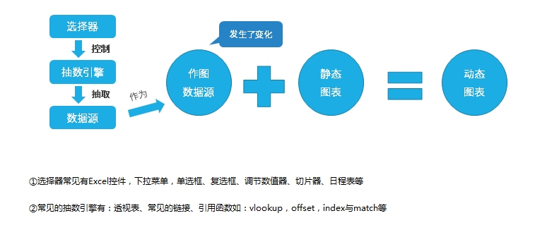 在Excel中常见的动态图表元素组合有:选择器+抽数引擎+图表=动态图表